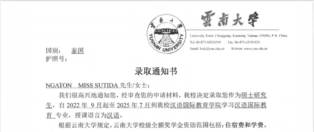 泰国籍留学生余露成功申请到云南大学硕士研究生对我校学历留学生是莫大的鼓励!未来,国际文化学院将进一步提升来华留学教育内涵,提升来华留学人才培养质量,持续服务“留学玉溪”的品牌打造,涵养更多知华、友华的留学生。