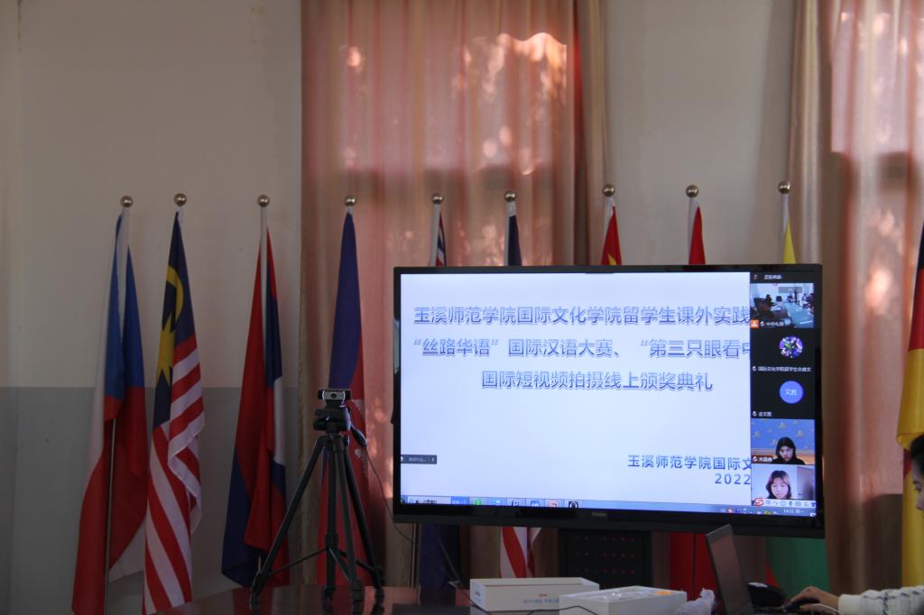 2022年11月14日,国际文化学院针对留学生参加的由“一带一路”国家院校和企业交流协会、汉语桥俱乐部(埃及开罗站)、Education Plus国际职业教育大会暨展览会组委会主办的“丝路华语”国际汉语大赛及中国外文局煦方国际传媒主办的“第三只眼看中国”国际短视频拍摄两个赛事主题,举办了颁奖典礼。国际文化学院杨春院长、吴晓颖副院长、杨艳教授,传习馆冯丽荣副教授以及学院全体师生参加了线上颁奖典礼;泰国清莱皇家大学中文系系主任朱鸿泰老师、视频拍摄指导教师陈尊严博士作为特邀嘉宾出席。