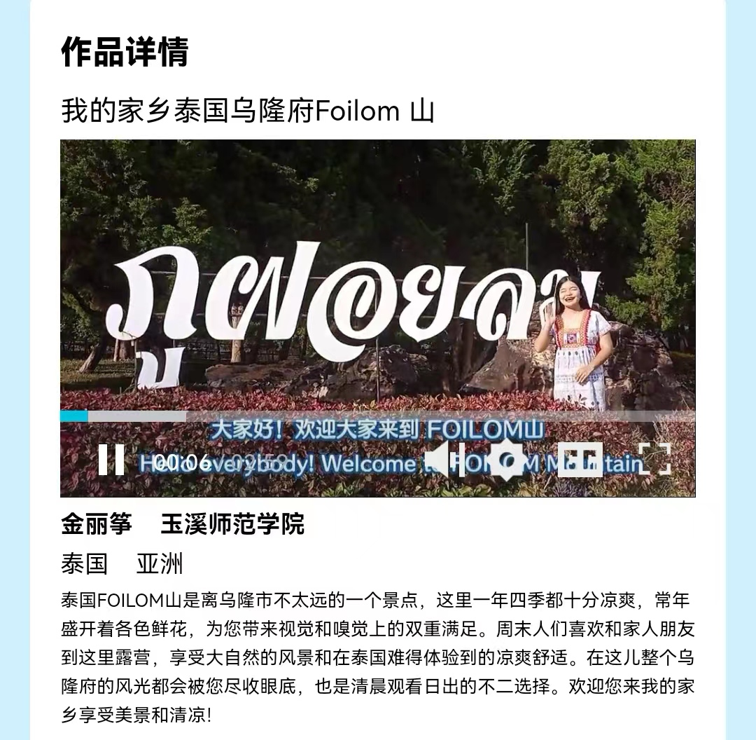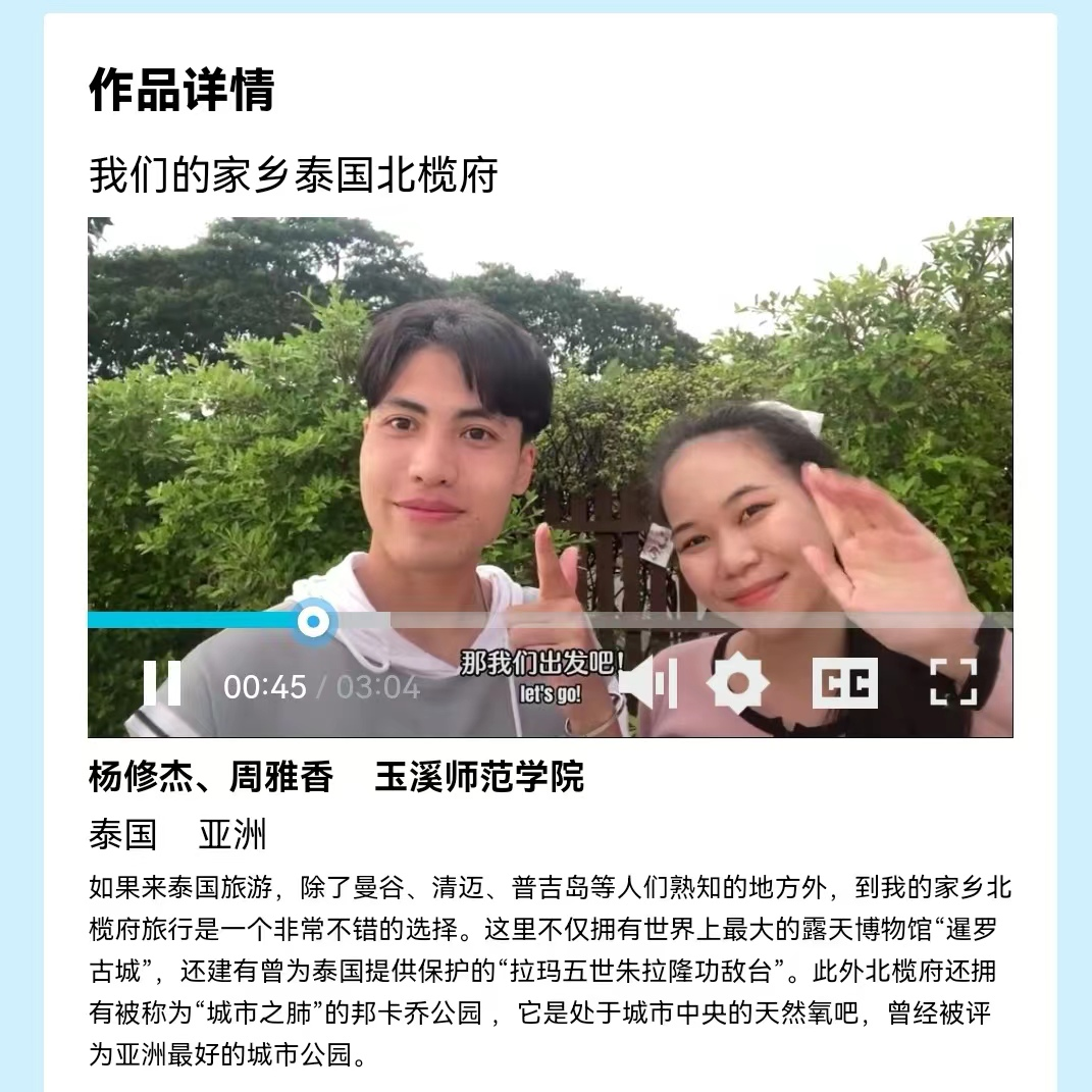 今年11月,教育部语合中心和中文联盟面向全球中文学习者举办首届“旅游+中文”视频征集大赛,大赛共收到来自50个国家的近300条视频作品,选手们用中文向全世界介绍自己家乡的自然风光、历史文物和民俗特产,欢迎全世界的人们去自己的家乡旅游。