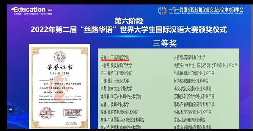 由“一带一路”国家院校和企业交流协会、汉语桥俱乐部、EducationPlus国际职业教育大会组委会及语文出版社等机构共同主办的第二届“丝路华语”世界大学生国际汉语大赛于今年6月启动,共有来自22个国家的100多名选手参赛。国际文化学院积极组织我校留学生参赛,学生们以中文学习故事讲述、中华诗词朗诵、中文歌曲演唱等形式录制视频参赛,通过作品初审、专家评审、网络投票、线上决赛等环节的激烈角逐,我校留学生杨修杰荣获三等奖,林可欣、金诗云等12位同学荣获优秀奖。