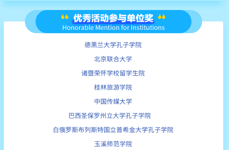 我校留学生杨修杰、周雅香、金丽筝三位同学的参赛作品荣获“优秀视频制作奖”,优秀视频在主办方官网和视频号向全球展播,其中一个作品人气排名进入四强。赵敏老师获优秀指导老师奖,我校荣获优秀活动参与单位奖。