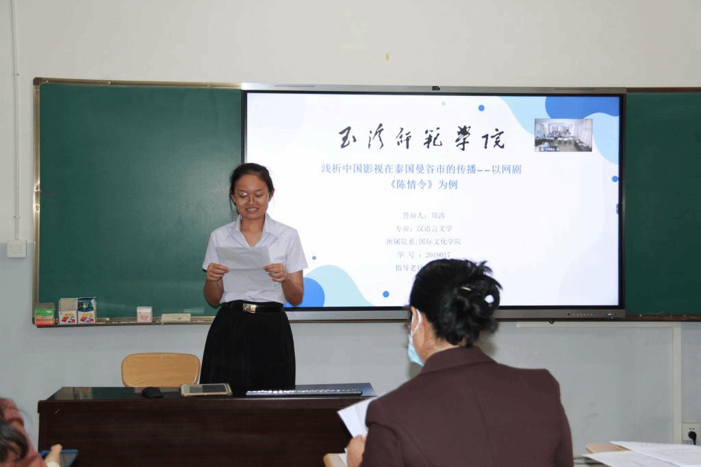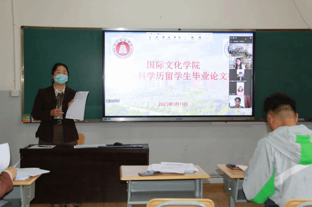 5月15日,国际文化学院2023届本科学历留学生毕业论文答辩顺利举行。我院杨春院长、周朝润副院长、杨艳教授、甘露博士,对外合作交流处吴晓颖副处长以及传习馆冯丽荣副教授作为答辩评委出席了答辩活动。2019级9名留学生参加本次答辩,2020级、2021级留学生全程旁听了答辩。根据留学生返校的实际情况,此次答辩采取了线下、线上相结合的方式,为已经返校的6名留学生、2名未返校的留学生、1名已返校但不能抵达答辩现场的留学生提供了平等的答辩机会。