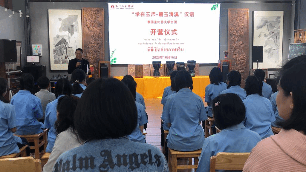 2023年10月13日,泰国那空沙旺圣约瑟夫中学24名师生顺利抵达玉溪师范学院,开启他们的“乐学玉师-碧玉清溪”汉语营。玉溪师范学院为这批营员精心设计了两周的中华优秀文化学习、体验活动,期望营员们通过学习、体验增进了解,促进中泰文化沟通与交流。10月16日上午,汉语营开营仪式顺利举行。