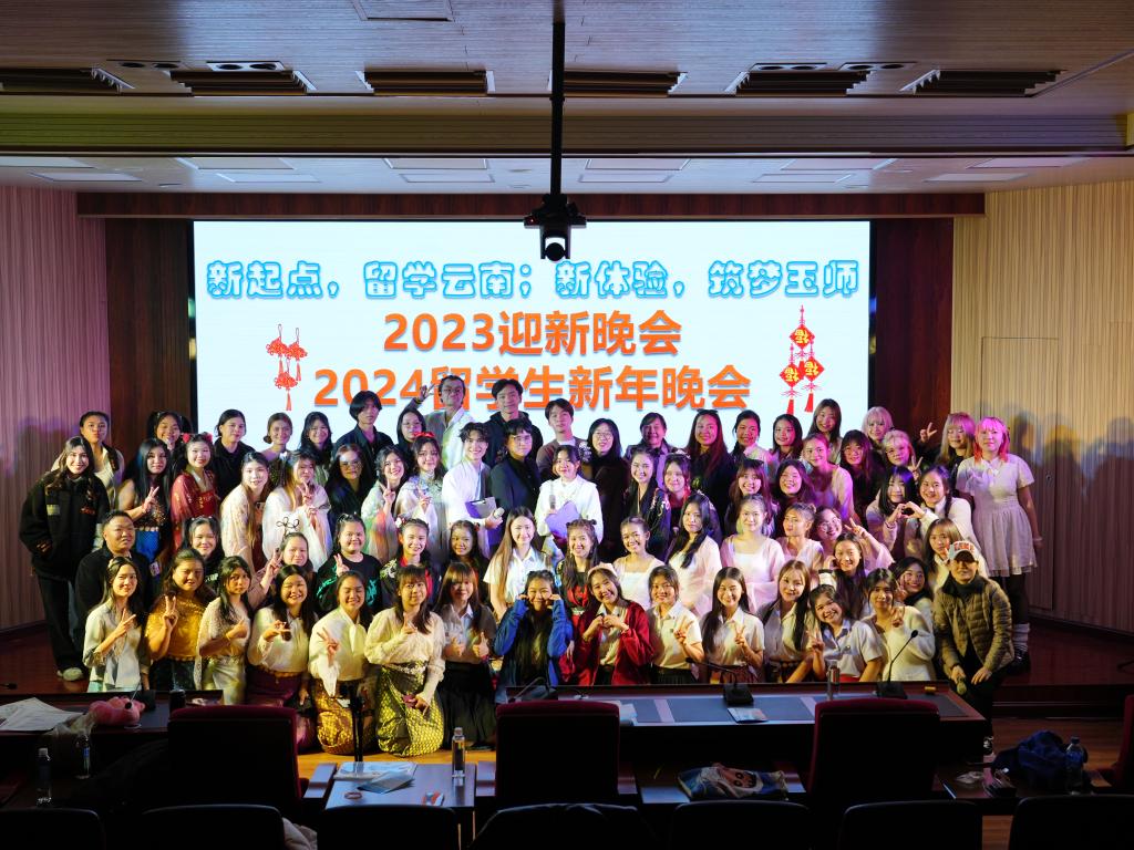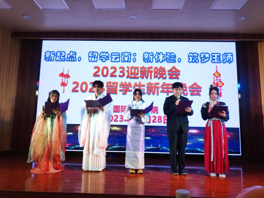 晚会开场后,杨春院长还为留学生们送出了“留学云南、筑梦玉师”的新年寄语。