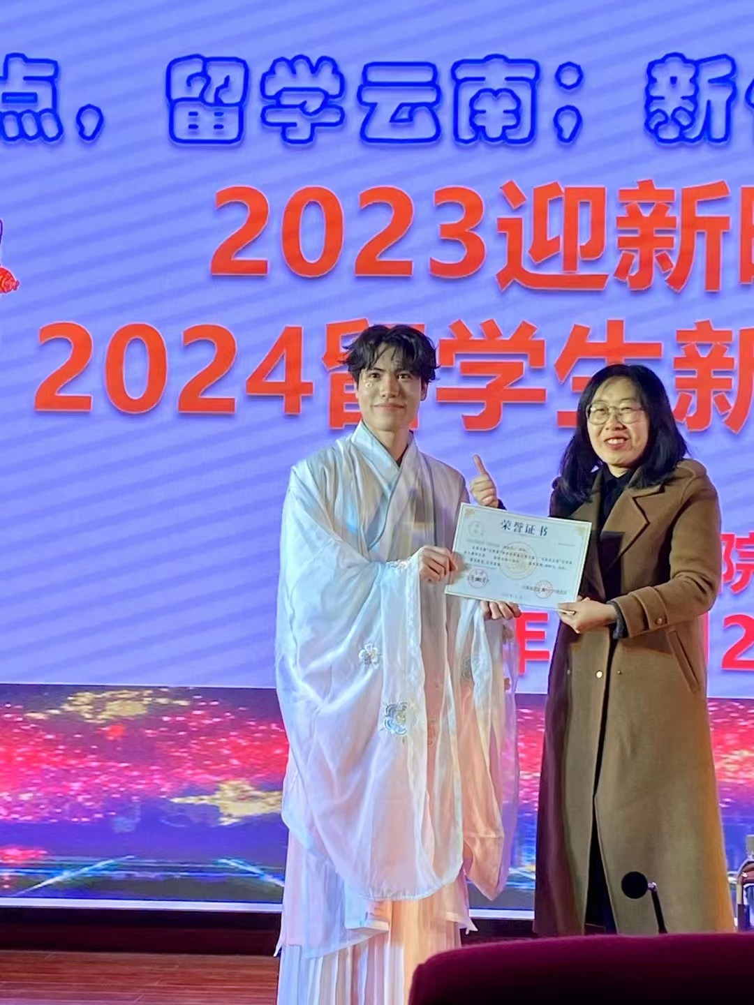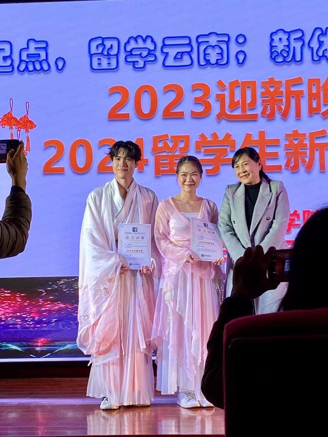 2023年,在国际文化学院倡导“以赛促学”的情况下,留学生们积极参加第一届“旅游+中文—3分钟导游,我向全世界介绍你”、第三届“丝路华语”世界大学生国际汉语大赛、第五届“云岭杯”中华经典诵写讲大赛等各类比赛,并且在比赛中表现优异,成绩突出。为进一步营造留学生“以赛促学”的良好学习氛围,国际文化学院特意将颁发2023年留学生们参与各类比赛的获奖证书设为晚会的环节之一。出席本场晚会的领导们为获奖的留学生们颁发了奖状。