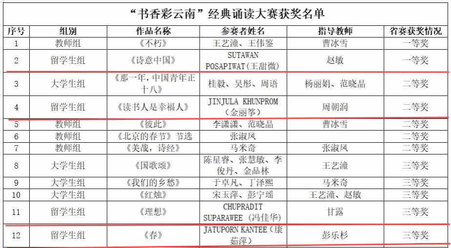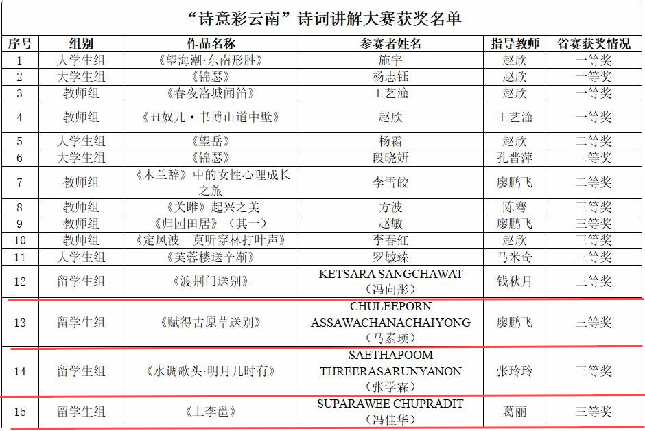 今年6月国际文化学院组织12名留学生参加了第六届“云岭杯”中华经典诵写讲比赛。6名留学生以《诗意中国》《读书人是幸福人》《理想》《春》《阿房宫赋》《雨巷》6组作品参加“书香彩云南”经典诵读大赛,6名留学生以《赋得古原草送别》《上李邕》《水调歌头·明月几时有》《游子吟》《观书有感·其一》《渡荆门送别》6组作品参加“诗意彩云南”诗词讲解大赛。