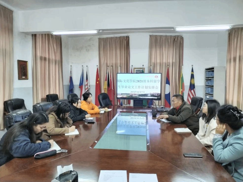 为了有序推进2021级留学生本科毕业论文的指导工作,提升留学生本科毕业论文指导工作的规范性和有效性,保障留学生本科毕业论文工作任务的顺利完成,2024年11月7日下午,国际文化学院召开了2021级留学生本科毕业论文专题工作会,国际文化学院副院长和全体指导教师、2021级本科留学生参加会议。