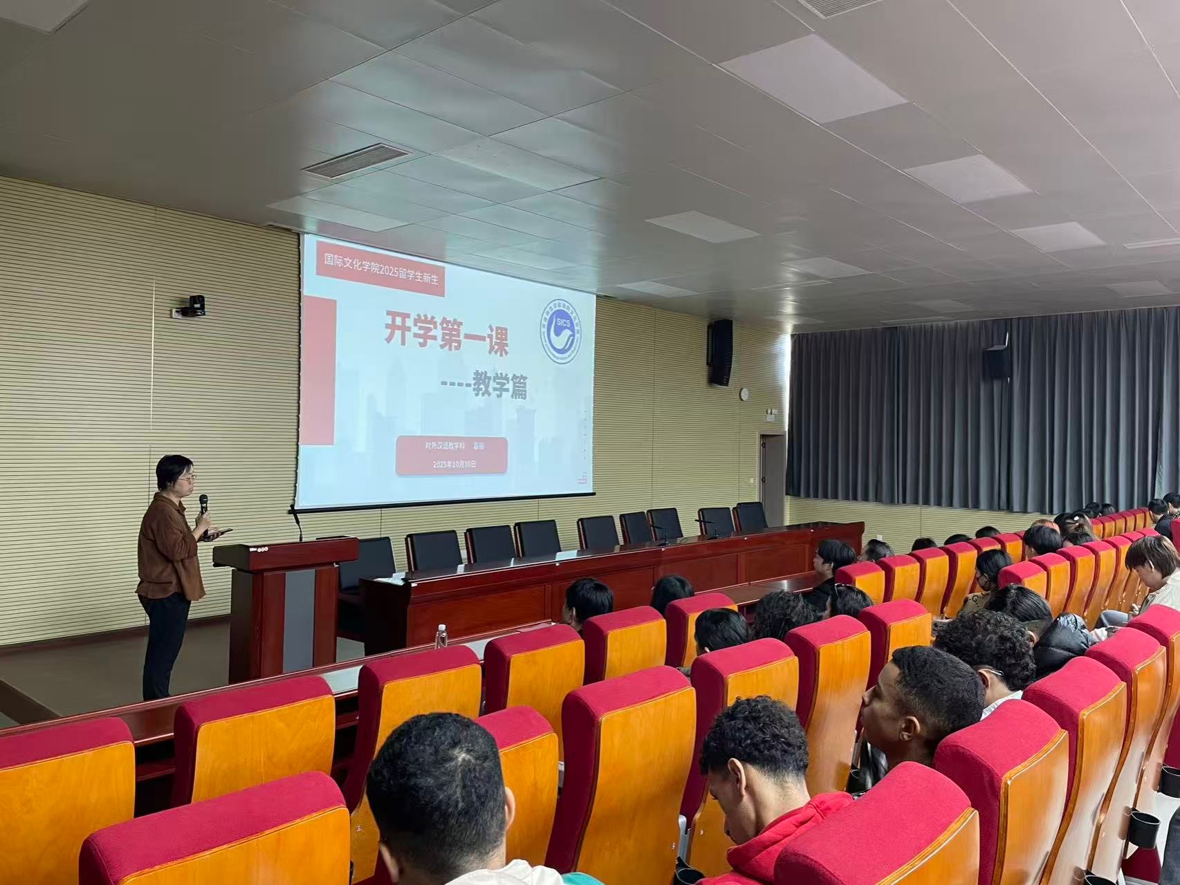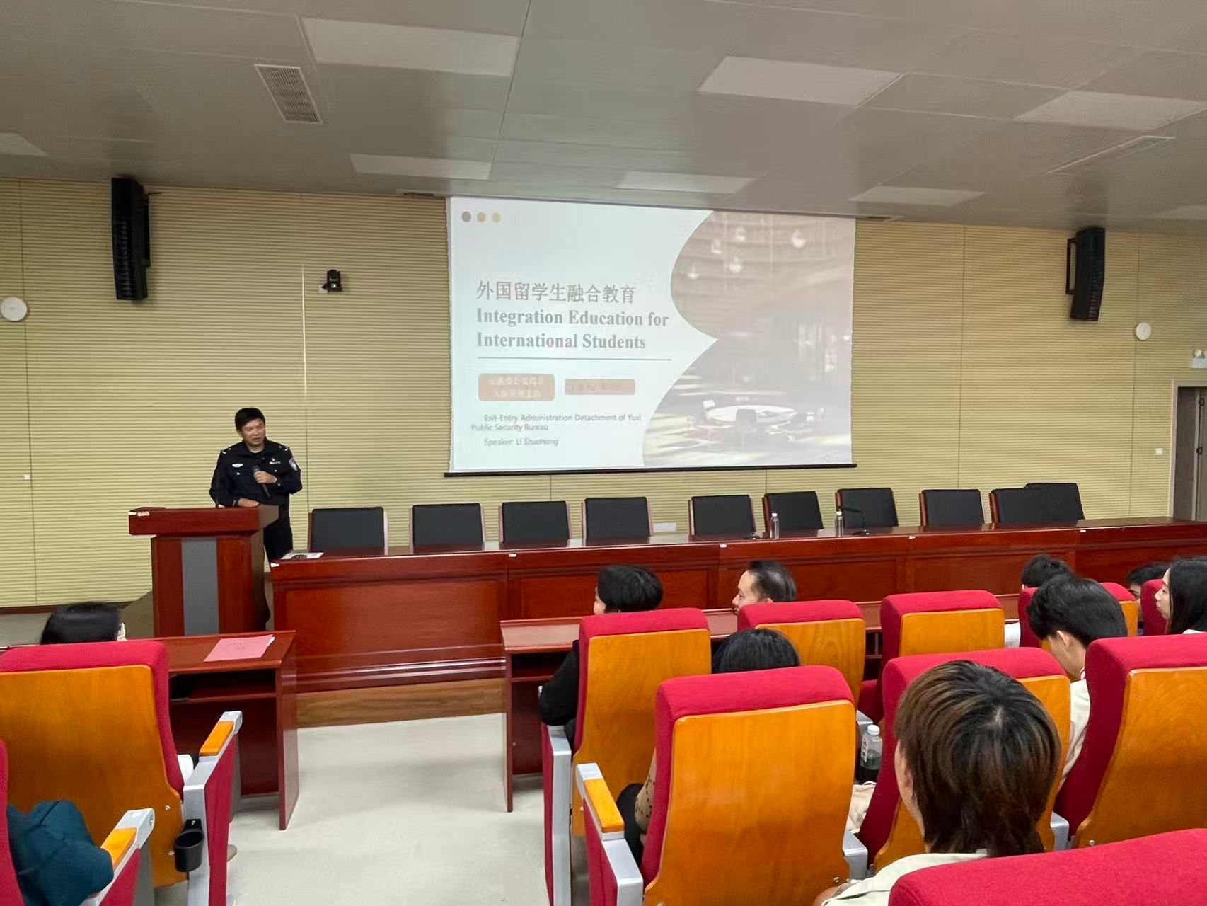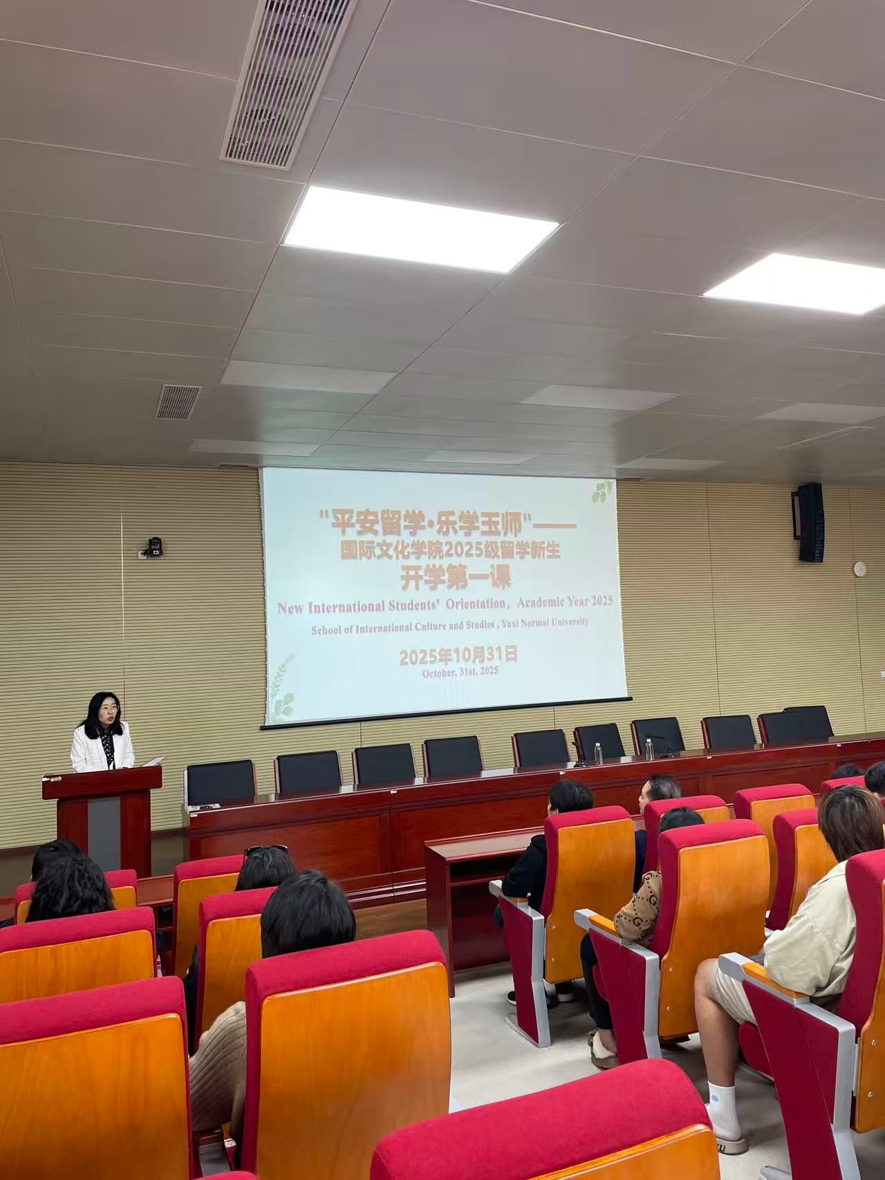 10月31日,国际文化学院为2025级全体留学生举行了新生“开学第一课”好的。本次活动旨在帮助新同学们尽快熟悉校园环境,了解在玉学习、生活的各项规章制度,顺利开启留学新生活。玉溪市出入境管理支队李绍洪警官、国际文化学院杨春院长、国际文化学院教学科和学生事务科相关老师以及全体25级留学生参加了活动。