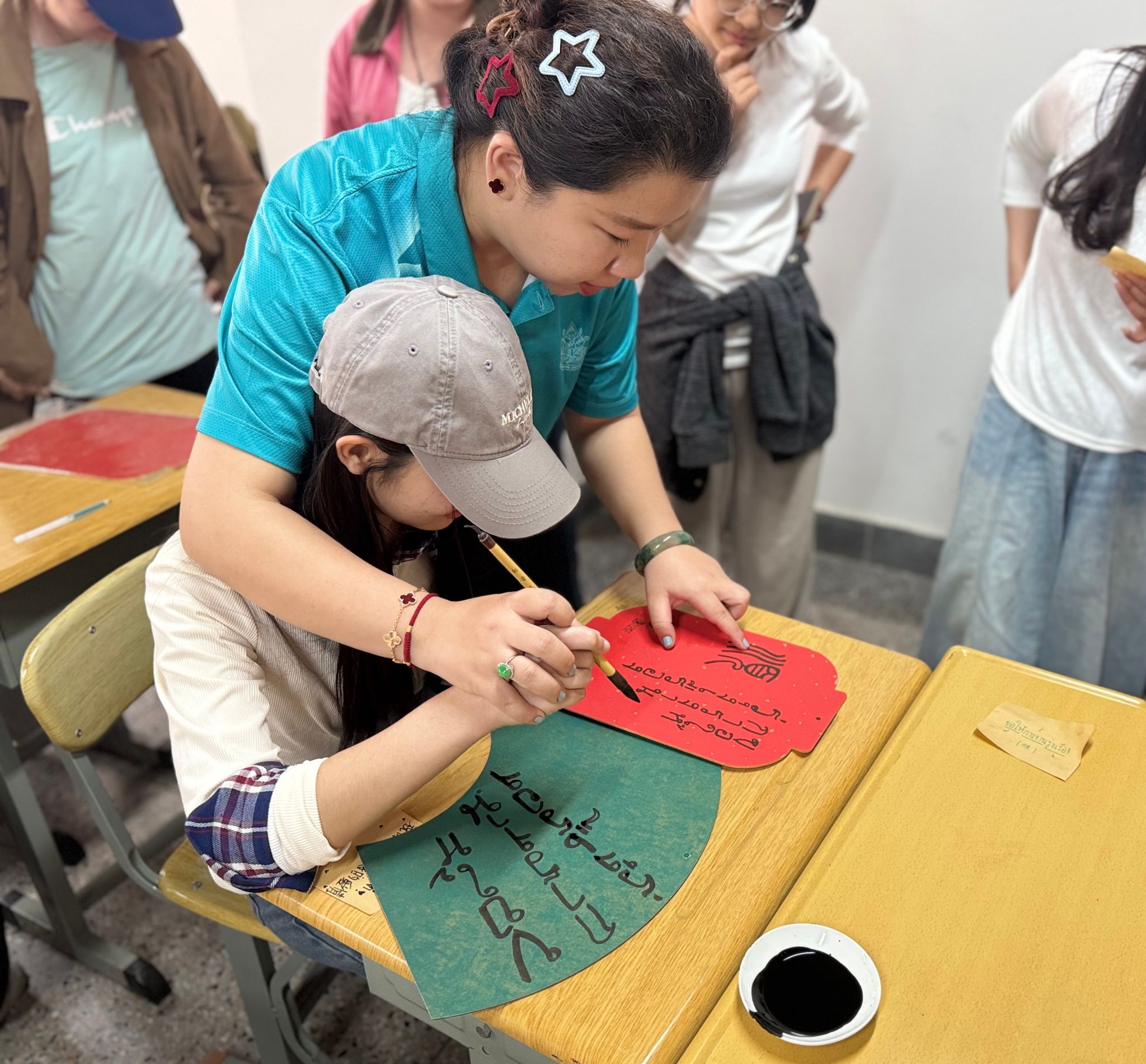 互动共创环节成为活动的亮点。泰国学生结合自身文化认知,将泰国文化思想凝练为一句话,与王恒老师交流分享。王恒老师及玉溪师范学院书法生以篆书的笔法书写泰文,将中华书法的韵味与泰文的独特美感相融;随后,泰国学生在同一扇面作品上书写大意相同的小篆,笔墨之间,既有对中华书法的尝试与热爱,也有对两国文化交融的美好期许。17幅共创扇面作品,每一幅都凝聚着中泰青年的心意,成为两国文化交融的生动载体。